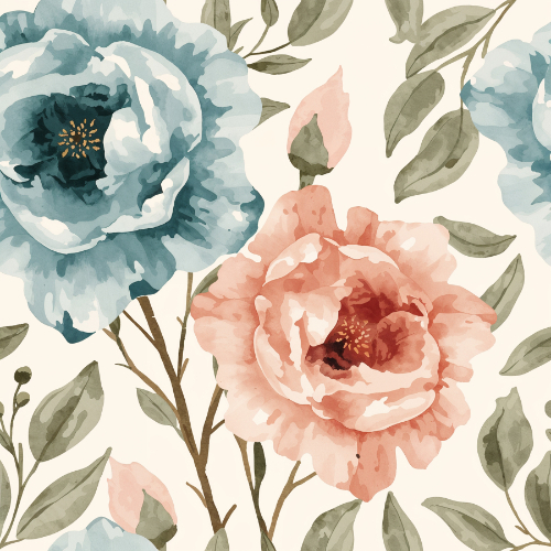 This elegant seamless floral pattern features large watercolor-style blossoms inspired by peonies and roses arranged in a graceful botanical composition. The flowers are illustrated with layered petals and soft watercolor textures that create a delicate and artistic appearance. The blossoms appear in soft peach and muted blue tones, forming a balanced color palette that feels both calm and sophisticated.