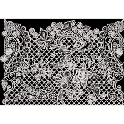 An intricate embroidery-style textile print featuring detailed white lace-inspired floral and ornamental motifs arranged as a rich decorative border on a black background.