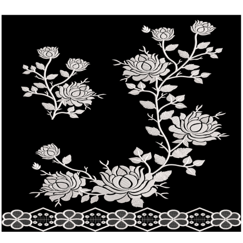 At the bottom, a continuous decorative border showcases a repeating geometric floral pattern, adding structure and finishing elegance to the overall composition. The contrast between the crisp white embroidery and the black background enhances clarity, depth, and visual sophistication.